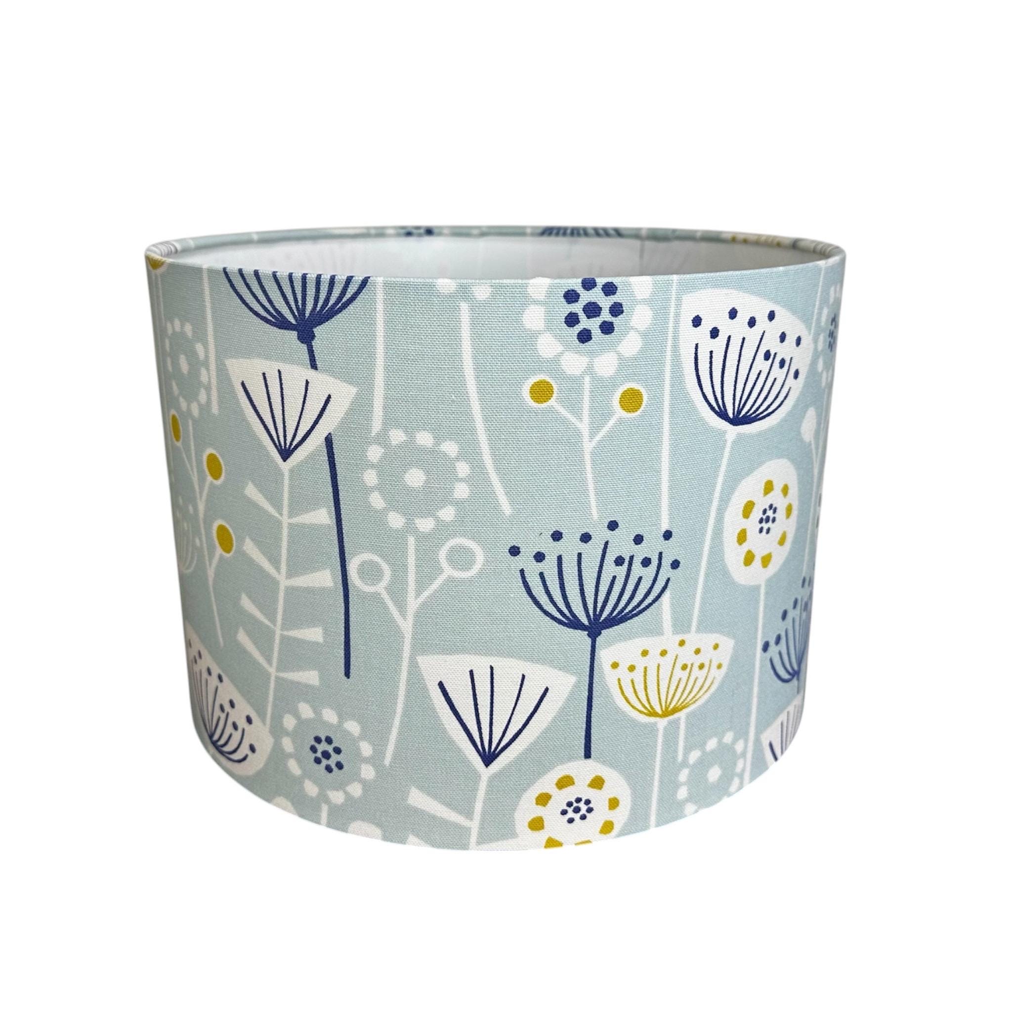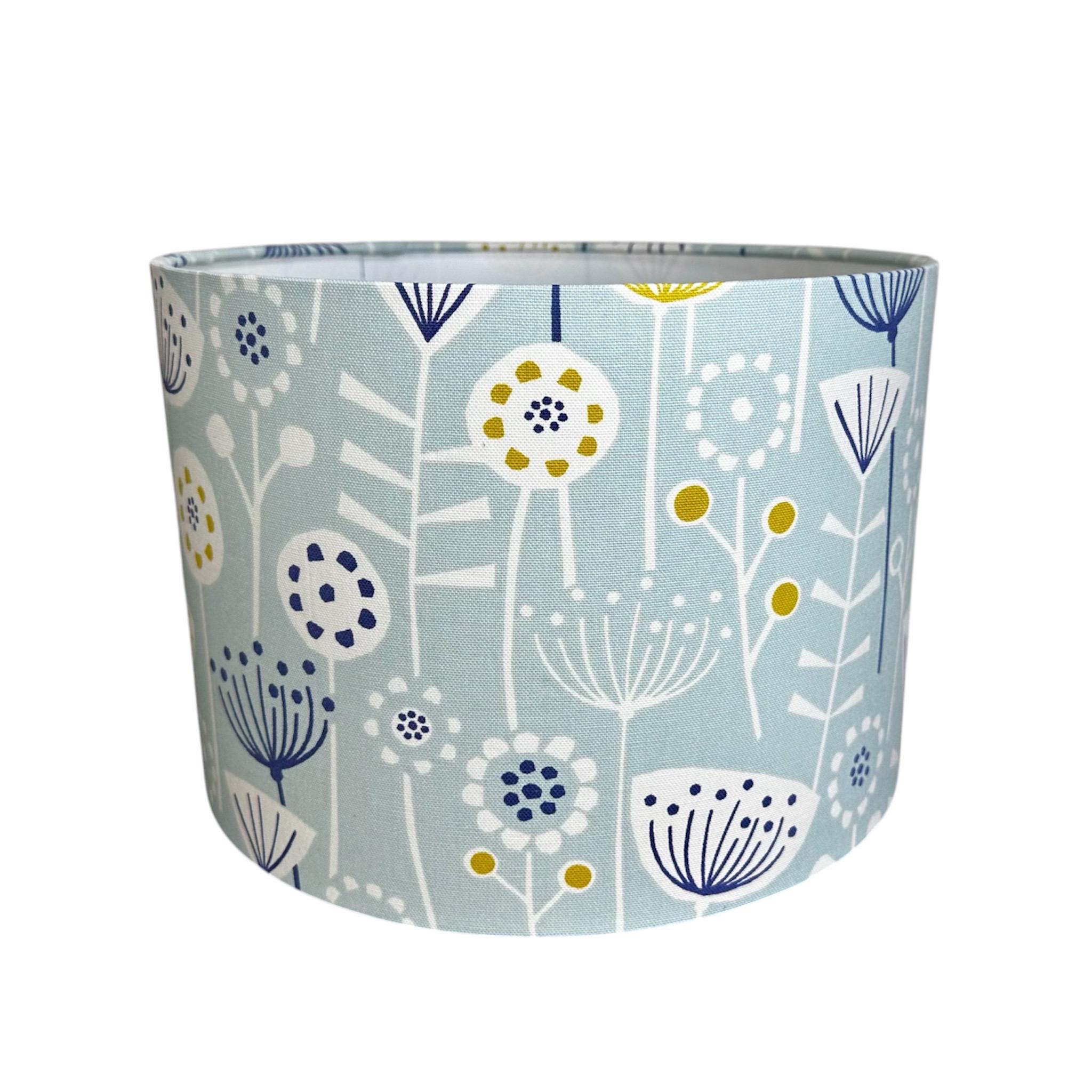 Fryetts Bergen Flowers Seafoam Drum Lampshade | Scandinavian Coastal Floral | Pale Blue Modern Ceiling or Table Lamp Shade