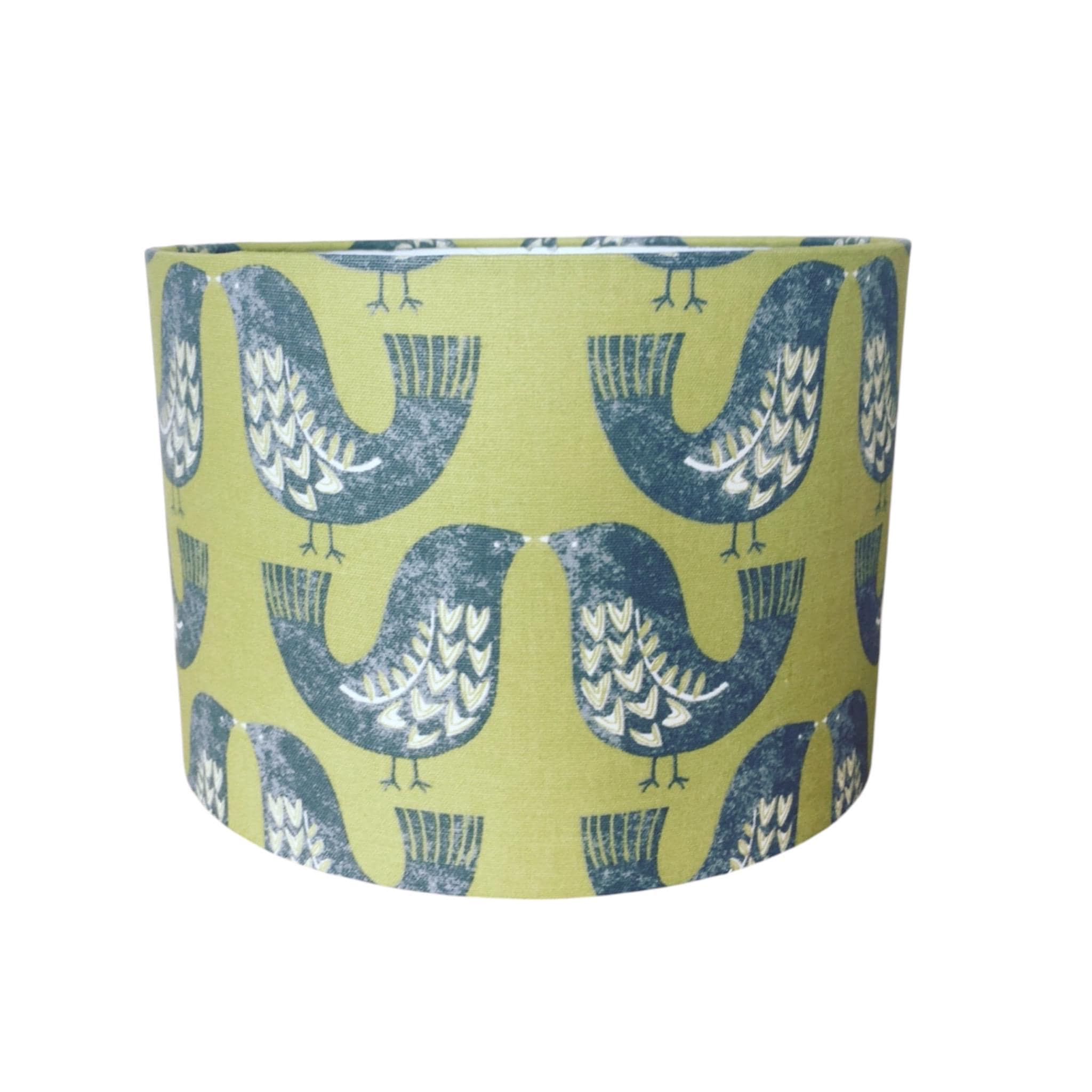 Iliv Scandi Birds Kiwi Green Drum Lampshade | Retro Scandinavian Lighting | Mid Century Modern | Statement Ceiling or Table Lamp Shade
